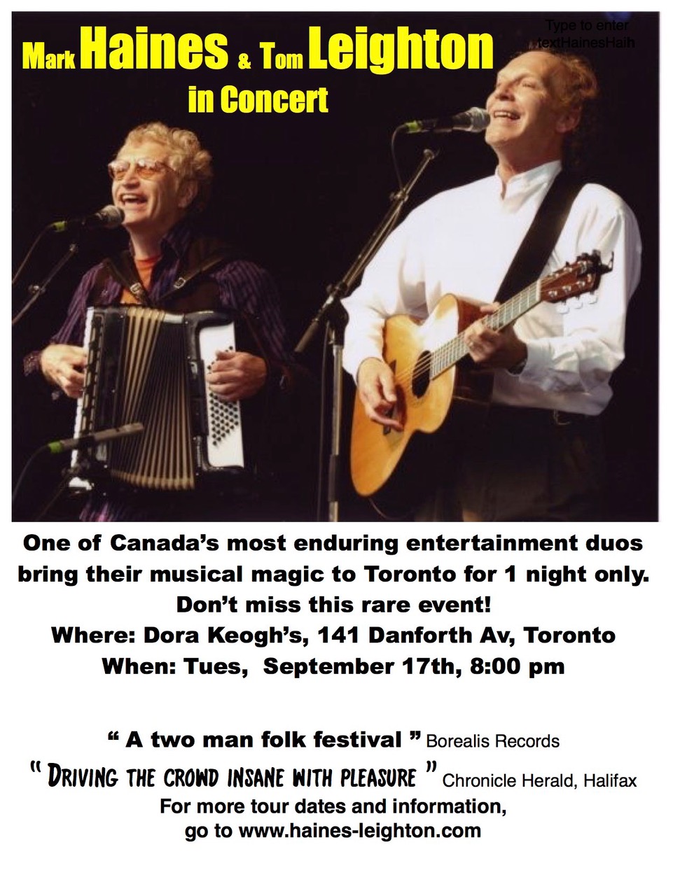 Jan 5th/ ’13 Mark Haines is coming up to Southern Ontario for a few selected dates. It’s been quite awhile since he has performed in Ontario so he and Tom will have a LOT of music to catch up on. Both have been very busy performing with others so it won’t be a question of being rusty, but more like how to fit in all the material that they like to play together. It will also be a blend of their concert material (especially at the Cuckoo’s Nest Folk Society) and more of their unique covers of “bar” material. It will be wonderful to see old – AND new  – friends.